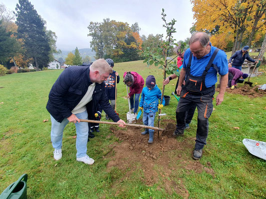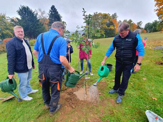Am Samstagvormittag trafen sich mehrere Mitglieder des Bienenzuchtvereins auf dem Friedhof in Zwiesel, wo ein passender Platz für den Baum gefunden wurde. Nach kurzer Vorbereitung ging es ans Werk: Es wurde gegraben, gelockert und gegossen – und natürlich auch gelacht. Die Wahl fiel auf einen Apfelbaum, der künftig nicht nur Schatten spendet und Früchte trägt, sondern auch zahlreichen Insekten, darunter unseren Honigbienen, wertvolle Nahrung bieten wird.